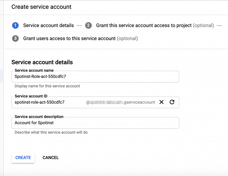 Create a service account for Spot actions. Name it as described in the wizard:
