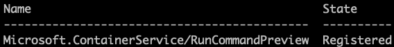 az feature list -o table --query "[?contains(name, 'Microsoft.ContainerService/RunCommandPreview')].{Name:name,State:properties.state}"You should see that the State is Registered as shown below.
