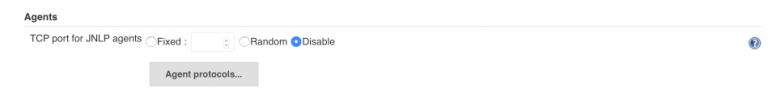 - To configure a fixed JNLP port for the Jenkins agents, go to Manage Jenkins > Global Security > Agents and set a static TCP port for JNLP agents.